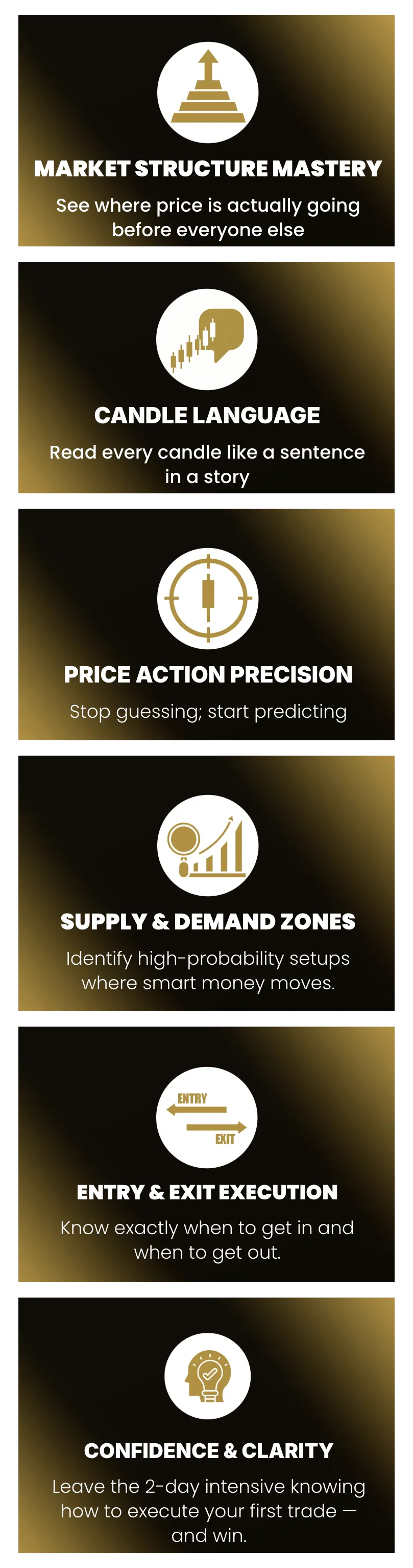 Leave the 2-day intensive knowing how to execute your first trade — and win.